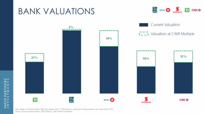 | Note: Based on Canadian Western Bank offer valuation June 12, 2024 relative to current bank holdings as of date shown in $CA. Source: Company investor relations, S&P Capital IQ. Value Partners Investments | When comparing this to the CWB valuation, we can see that Royal Bank is getting close to a point where they are fairly valued on a precedent transaction basis. This is because the business has been doing well from a share price perspective with Royal Bank up 22% since the start of the year. Therefore, we have been trimming this position, locking in gains, reducing risk, and raising cash to add to other exciting opportunities. | |